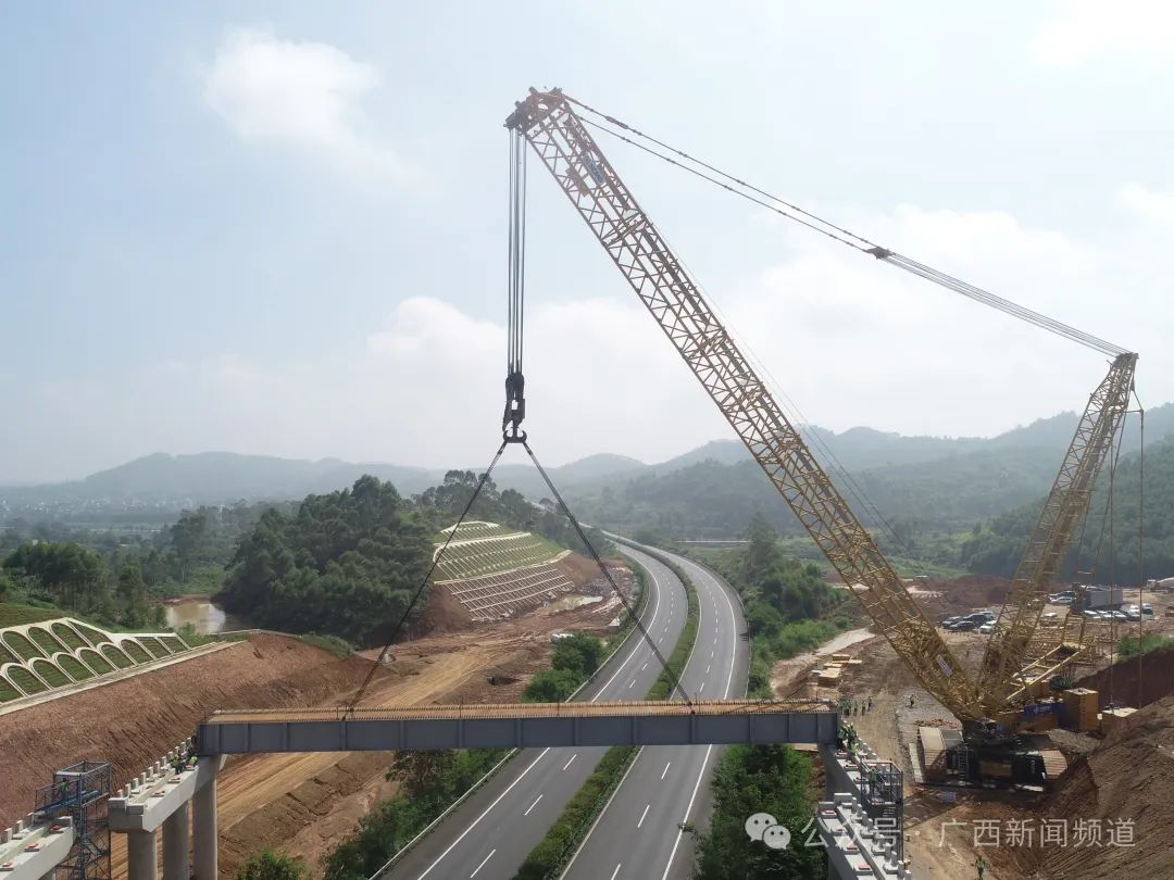 8月24日上午,伴随着1250t履带吊的轰鸣,首节50m长、119t重的钢梁节段平稳吊放至桥墩暂时支座上,金鸡北纽带贵梧主线跨线大桥首节钢梁装置顺畅完成,拉开了金鸡北纽带跨高速施工的前奏。