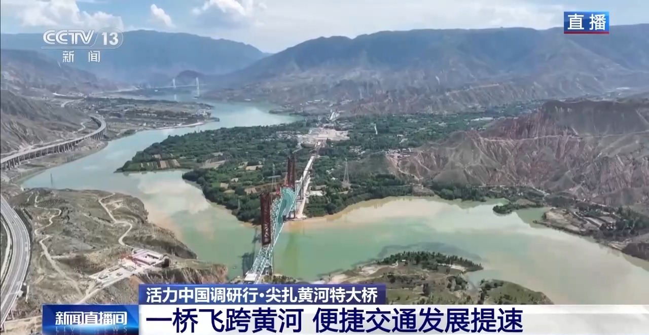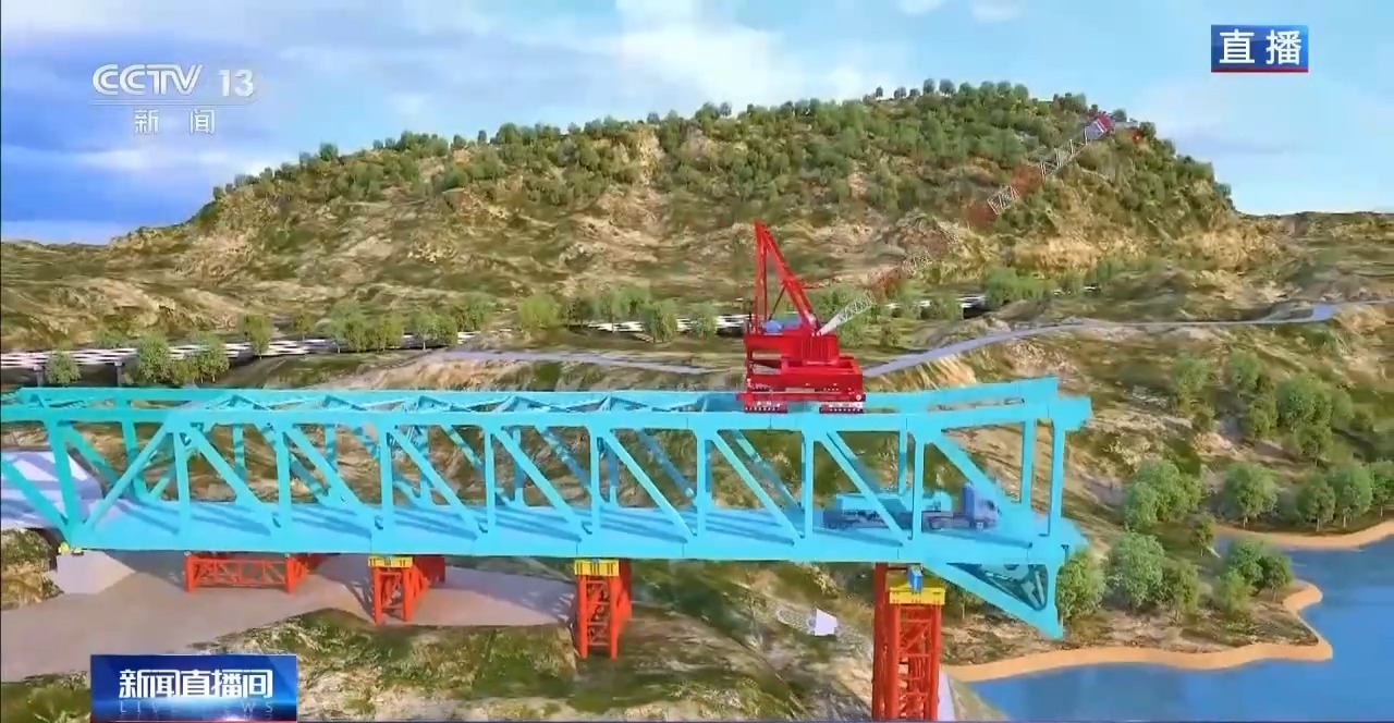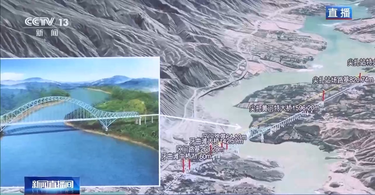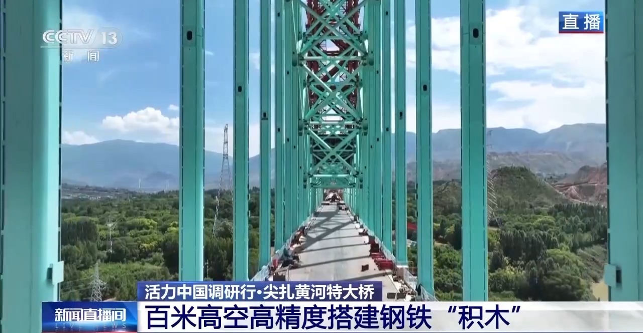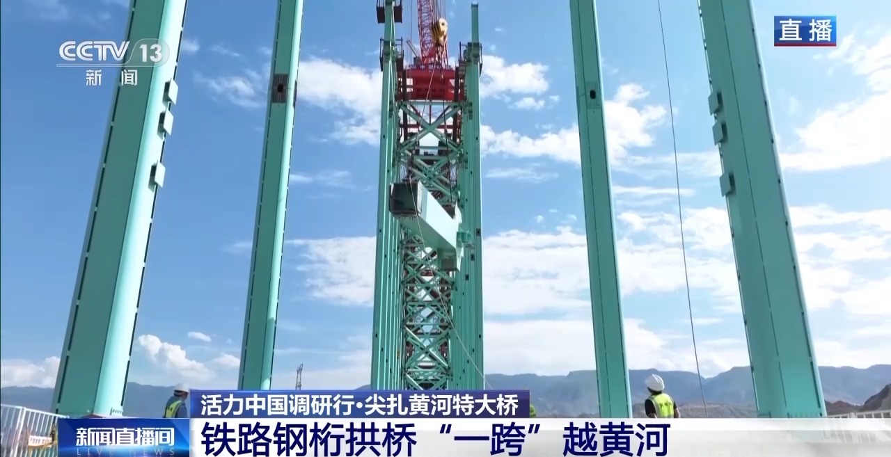 总台记者 葛修远:在海拔2200米的川青铁路重点工程尖扎黄河特大桥的建设现场,我的脚下55米处就是黄河的水面,主跨的拱顶距离黄河水面130米,相当于40层楼高。大桥两侧距离还有90米,预计8月底就可以合龙。