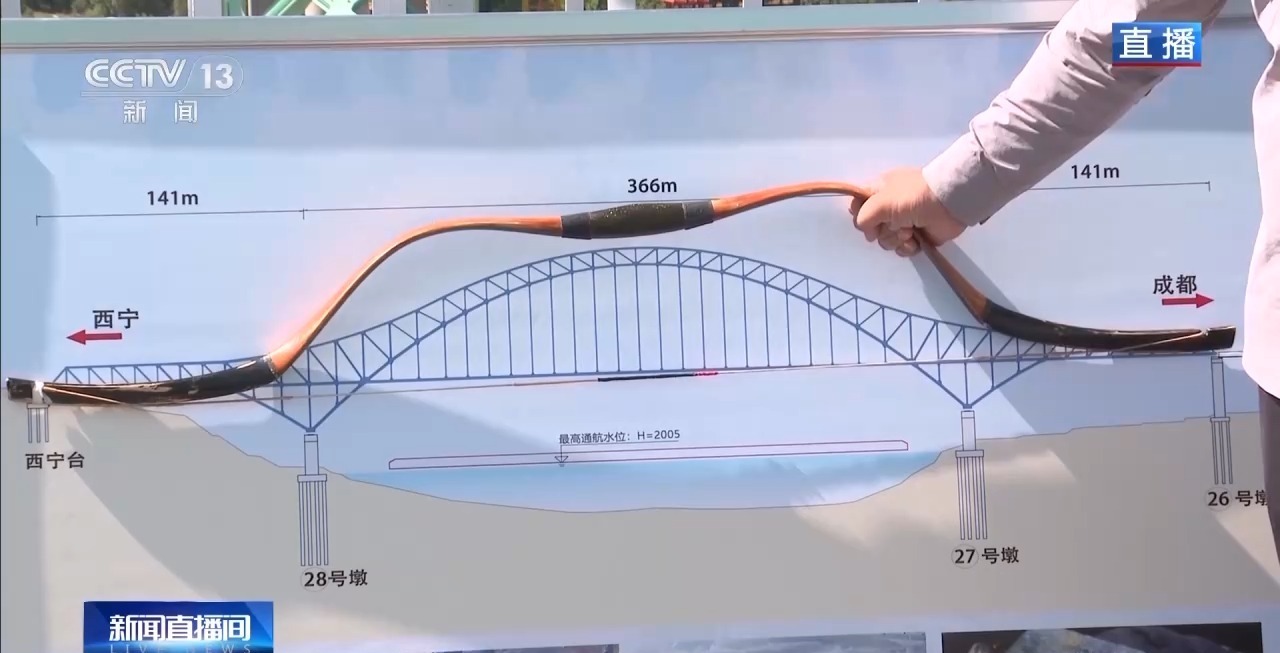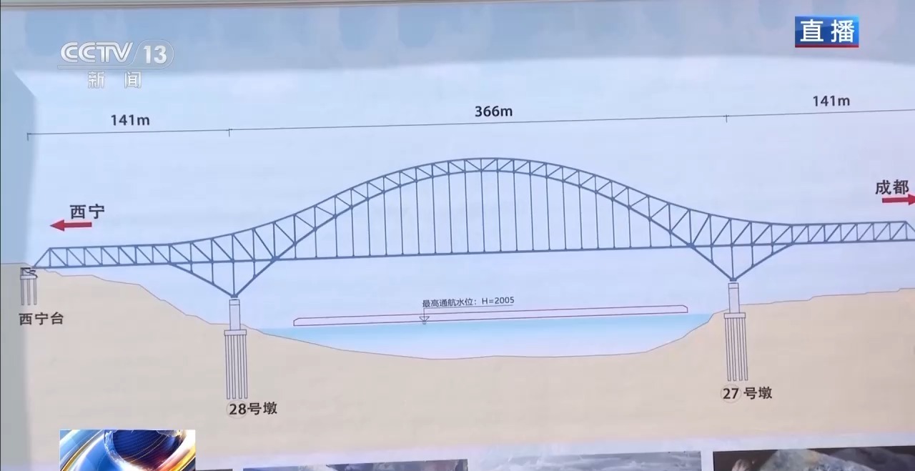 总台记者 葛修远:尖扎黄河特大桥位于青海省黄南州尖扎县和海东市化隆回族自治县的交界处,整个特大桥长1596.2米,宽15米,主桥部分为三跨连续钢桁拱桥。“跨数”是建筑术语中的一个数量概念,两个支座之间算一跨。尖扎黄河特大桥主跨达366米,整座大桥建成后可以“一跨”越黄河,它也将变成全球最大跨度双线铁路连续钢桁拱桥。
