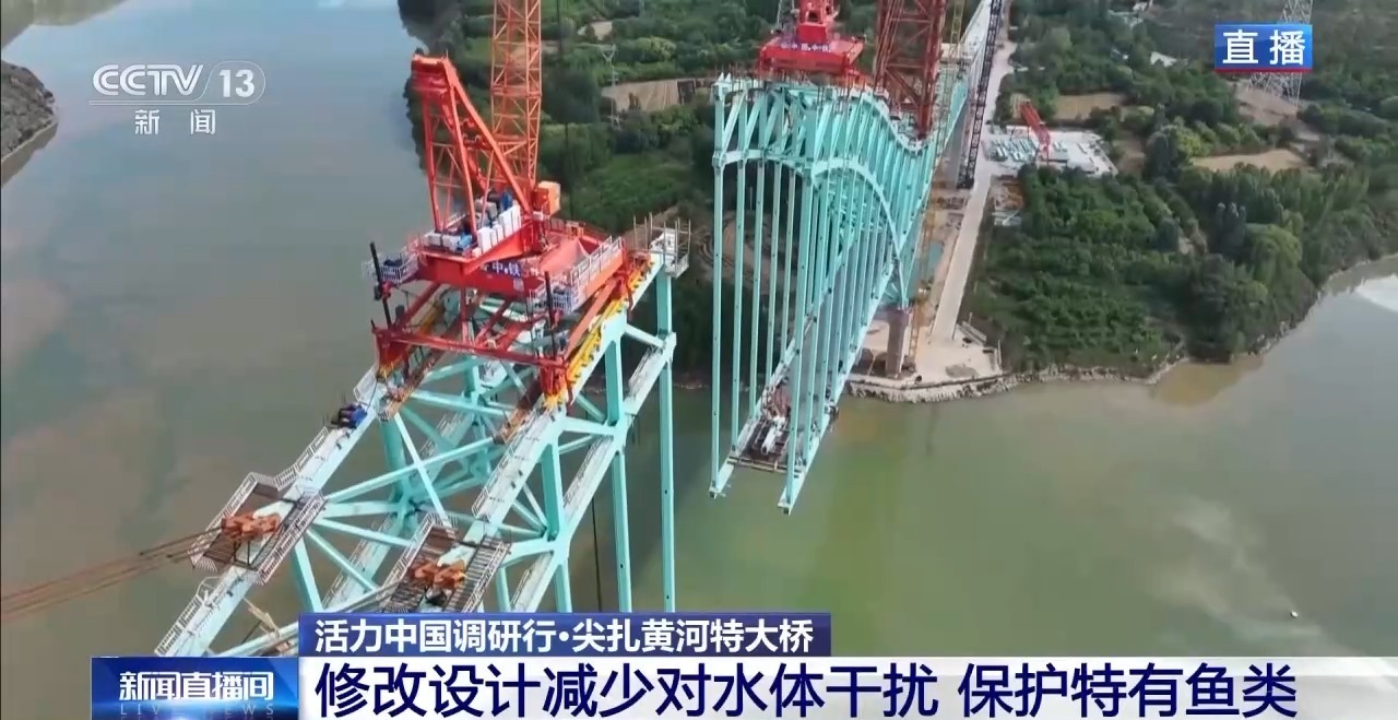 总台记者 葛修远:施工部门还采用拱、梁同步架设的方案,建筑材料通过桥面进行运输,避免船舶在黄河中航行。同时,大桥所有组件的油漆全部在工厂喷涂完成,尽可能地减少对河水的污染。